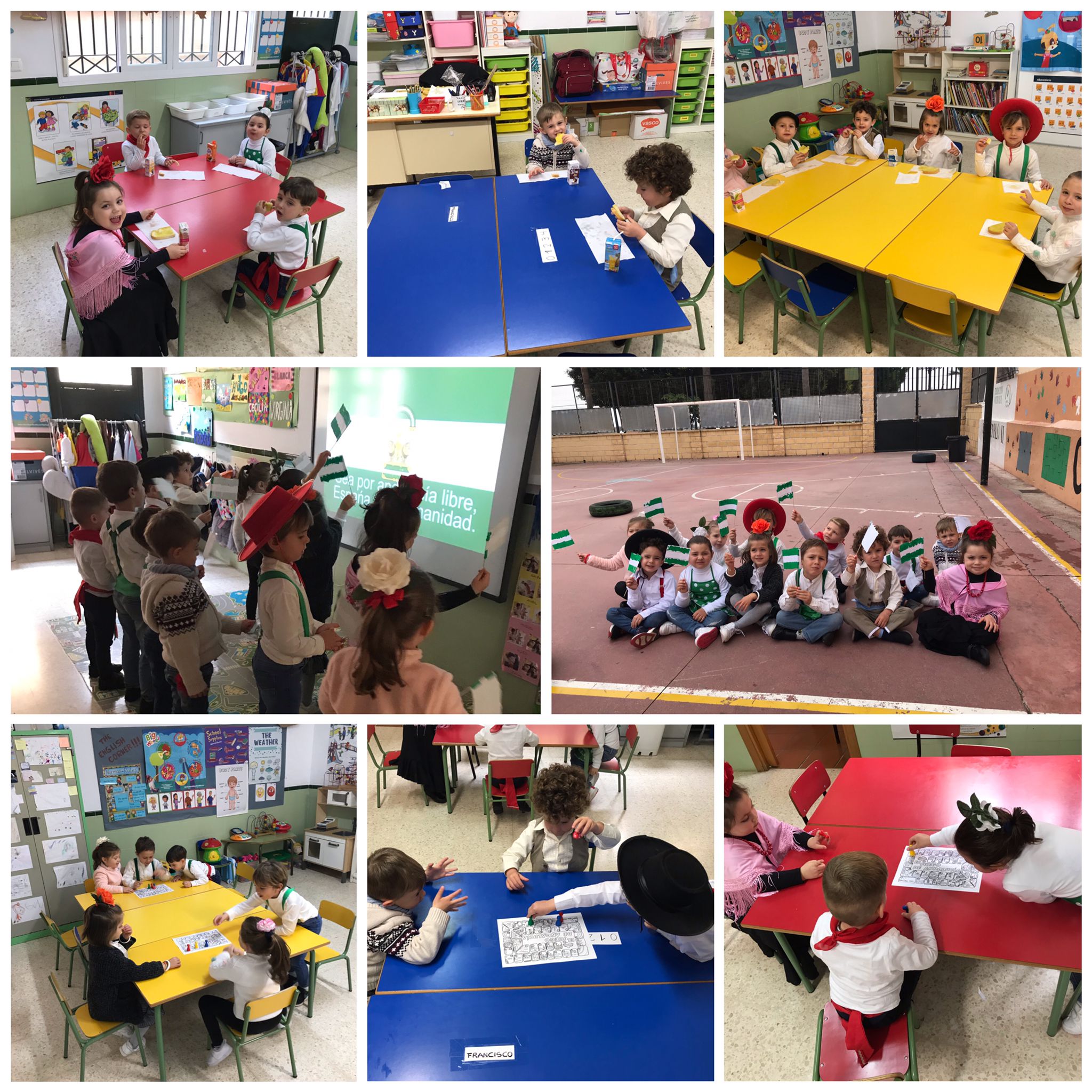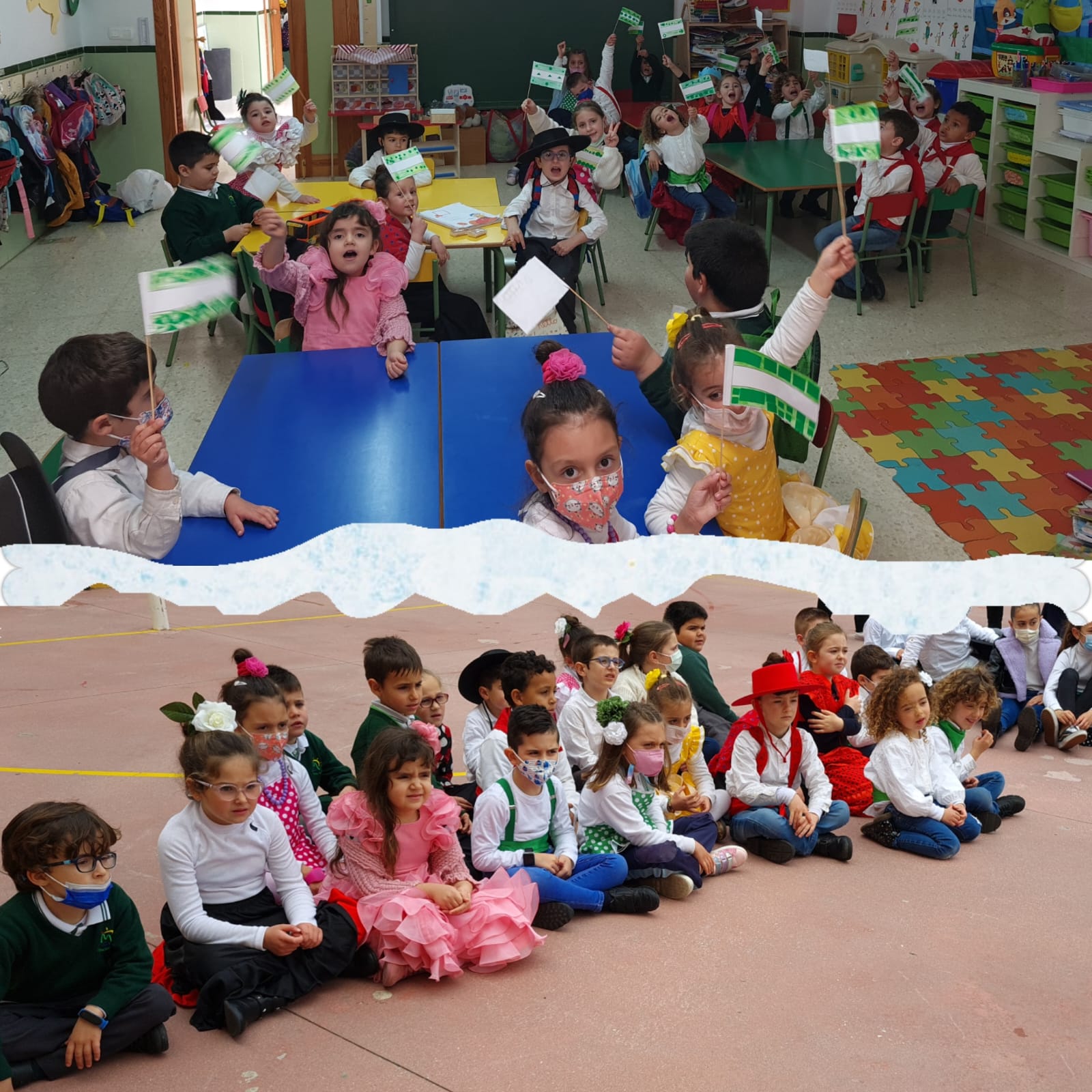 Orgullosos de ser andaluces. Así nos sentimos al recordar y valorar nuestras raíces. Las paredes del Colegio hablaban por sí solas, el olor a pan con aceite impregnaban las aulas, hemos bailado, hecho juegos, y para terminar, todos hemos cantado el Himno de Andalucía.